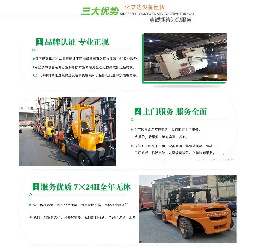 亿立达设备租赁有限公司是工商局准许的南开大学滨海学院专业叉车出租公司,公司本着诚信、服务、效率、创新的经营理念,用精湛的技术,真诚的服务,为众多客户提供优质的服务,同时获得信赖与支持。专业提供南开大学滨海学院3-20吨叉车出租、叉车租赁、设备搬运、集装箱掏箱装箱、机器移位定位、货物装卸、工厂搬迁、安全可靠,收费透明,价格便宜,随叫随到,24小时上门服务!本公司叉车吊车师傅对各种设备搬运装卸都有深刻探讨和研究。很多的疑难设备搬运,通过我公司的叉车师傅都能迎刃而解。对各种进口设备、国产机器、大型设备搬迁、高难度搬迁、各种精密仪器、医疗设备、科研设备等都能搬运; 提供全市 24 小时上门装卸搬运服务。同时提供厂房搬迁服务。 ...